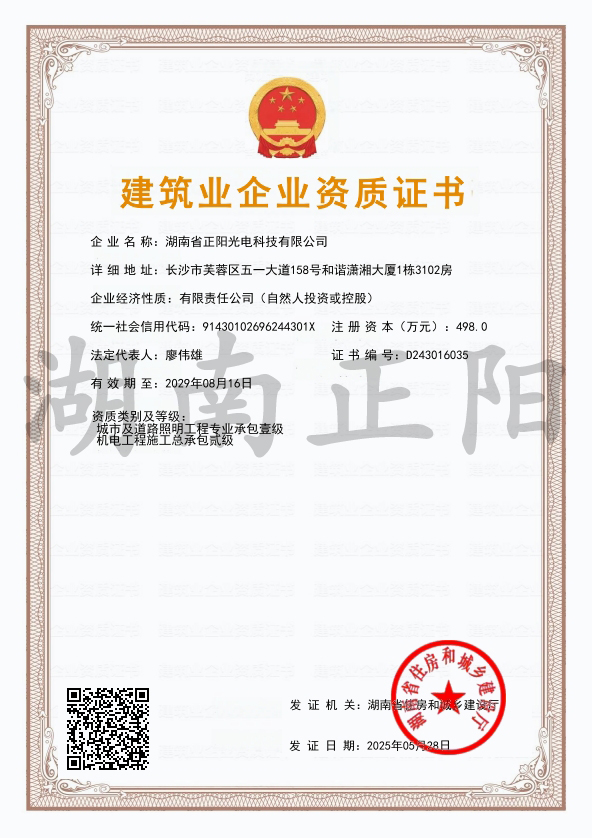 2025年4月8日,經(jīng)長(zhǎng)沙市住房和城鄉(xiāng)建設(shè)局審核批準(zhǔn),湖南省正陽(yáng)光電科技有限公司成功獲得“施工勞務(wù)”資...